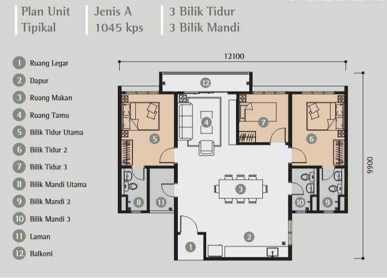 📏 3 Bilik, 3 Bilik air: 1045SQFT